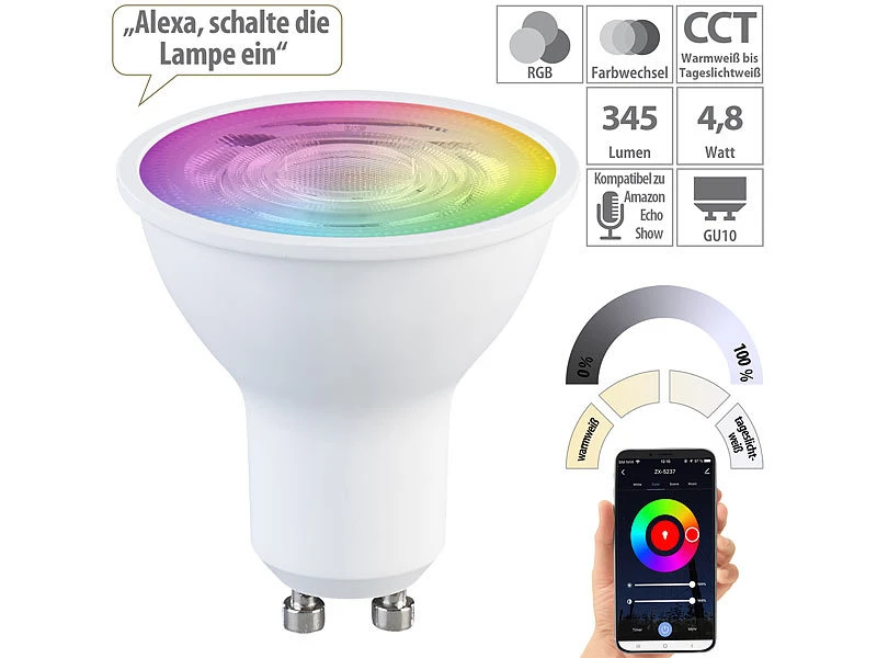 - Anpassbare Lichtfarbe: RGB für 16. Mio. Farbtöne und CCT mit 2200 – 6500 K (warmweiß bis tageslichtweiß)