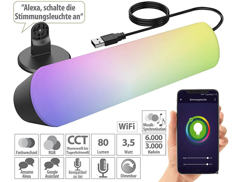 - WLAN-Stimmungsleuchte mit USB-Stromkabel inklusive Ständer mit Montagematerial und deutscher Anleitung – RGB Lampe – Außerdem relevant oder passend zu: Bad, Küche, Regal, Party, Dimmer, Bar, Schalter, Leselampe, Fernseher, Kugel, Leiste, Controller, Leseleuchte, Deckenlampe, Streifen, Fernbedienung, Tischlampen, Deckenleuchte, Leuchte Kinder LED, Kabellose Stehlampe, TV Hintergrundbeleuchtung