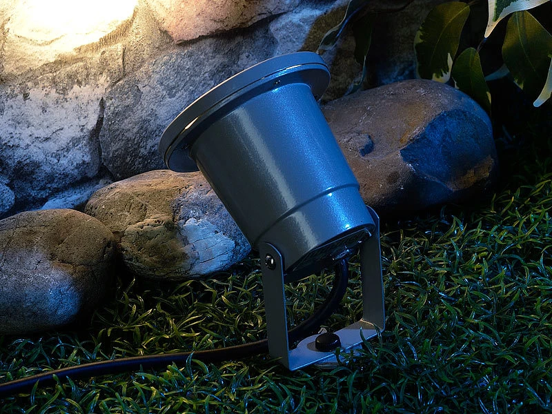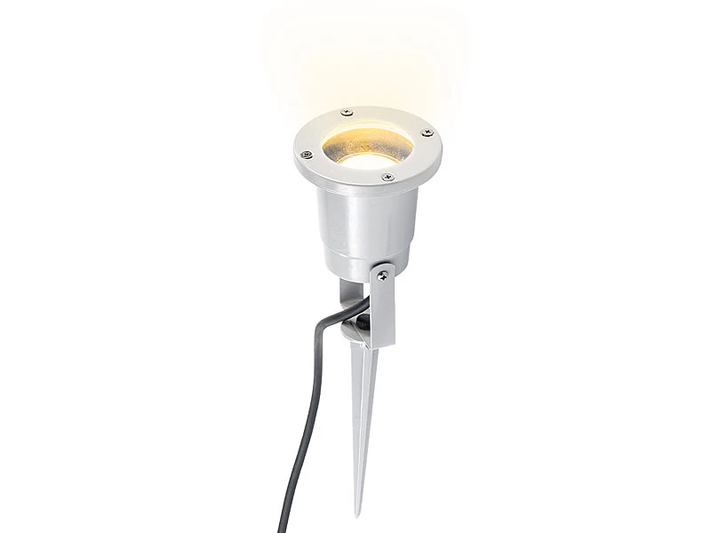 - Bodenstrahler inklusive Lampensockel, Bodenspieß, je 1,5 m Stromkabel und deutscher Anleitung