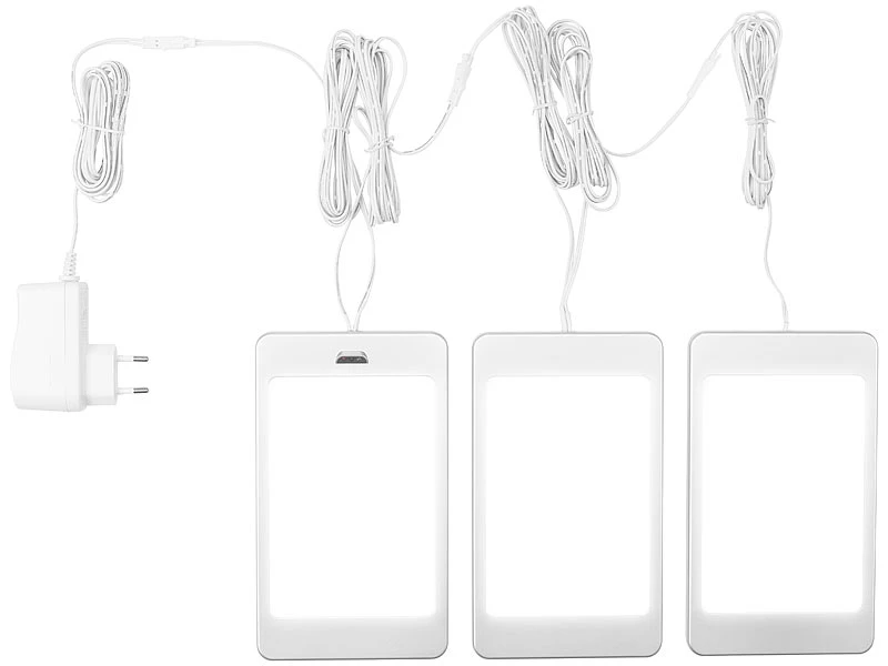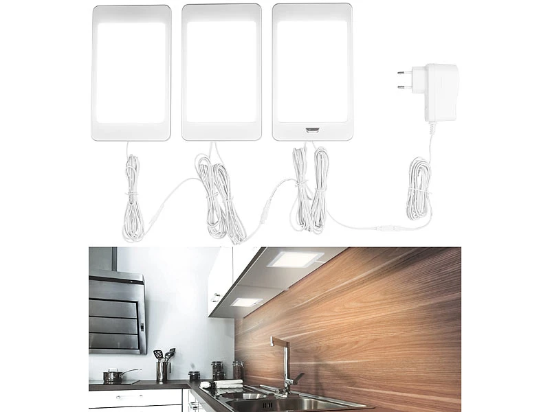 - 3er-Set LED-Unterbaupanels inklusive Anschlusskabel (1,5 m), 2 Verbindungskabeln (je 2 m), Montagematerial und deutscher Anleitung – Unterbaulampen – Außerdem relevant oder passend zu: Möbel, Küche, Panels, Dimmer, Leiste, dimmbar, Leisten, Infrarot, Unterbau, Deckenlampe, Beleuchtung, Nachtlichter, Deckenleuchte, Einbaustrahler, Steckdose, Unterbauleuchten warmweiß, Nachtlicht Bewegungsmelder, Schrankbeleuchtung Bewegungssensor