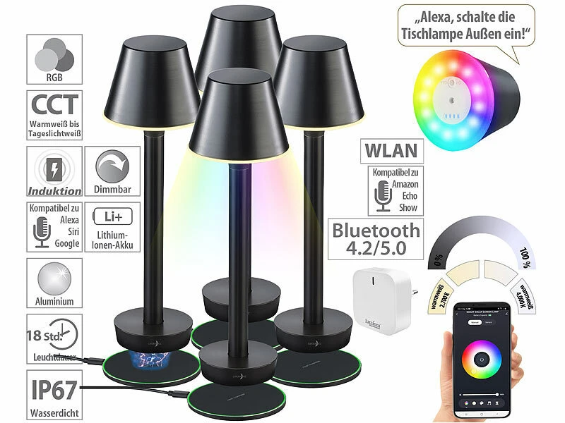 - Kabellose Outdoor-Tischlampe mit Akku und Qi-Ladematte