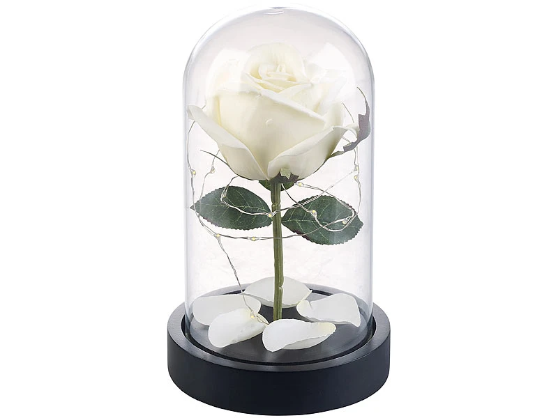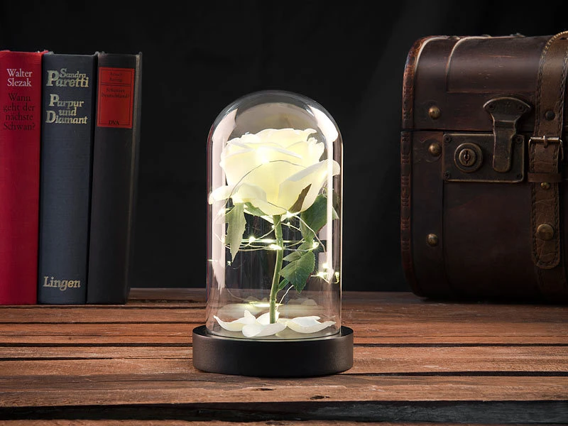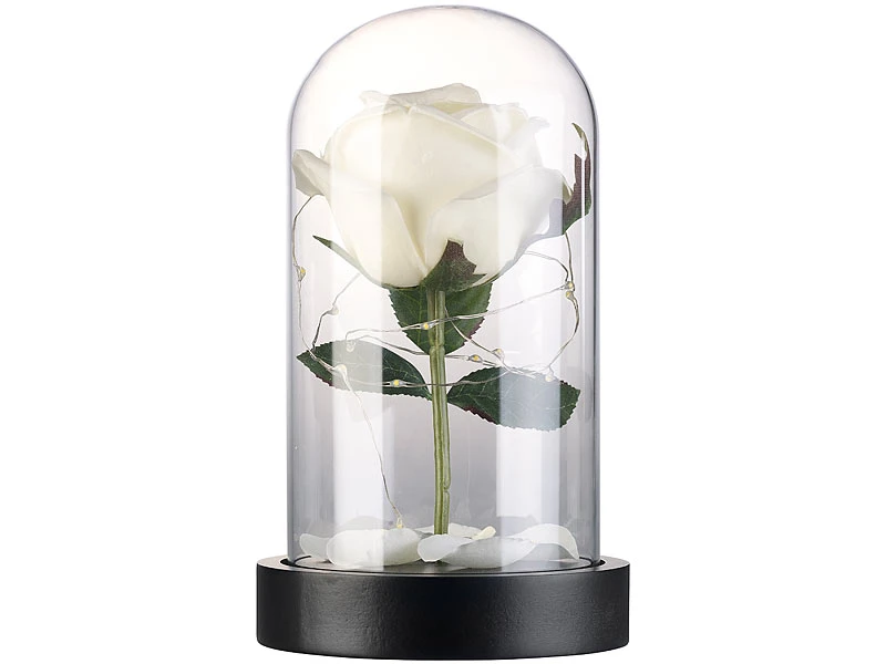 - Rose auf Plattform inklusive Kuppel-Vitrine und deutscher Anleitung – Rose im Glas mit Lichterkette – Außerdem relevant oder passend zu: Liebe, Ewige, Licht, Beauty, Blüten, Ostern, Frühling, Pflanzen, Abdeckung, Muttertag, romantisch, Glasglocke, Valentinstag, Lichterketten