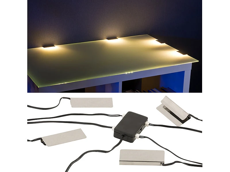 - Glasbodenbeleuchtung mit 4 LED-Clips inklusive Netzteil und deutscher Anleitung – LED-Beleuchtung Vitrine Glas – Außerdem relevant oder passend zu: Möbel, Leisten