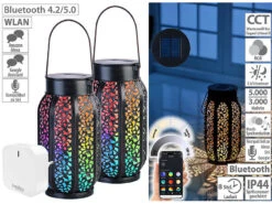 Wunderschönes Farbenspiel: Lassen Sie Ihre Solar-Laterne in Warmweiß oder Tageslichtweiß leuchten. Oder entscheiden Sie sich für eine bunte Beleuchtung aus 16 Millionen Farbtönen! Auf Wunsch wechselt die Farbe sogar passend zur Musik!