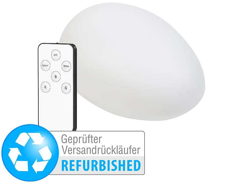 - LED-Deko-Stein inklusive Akku, Fernbedienung mit Knopfzelle, 2 Erdspießen und deutscher Anleitung