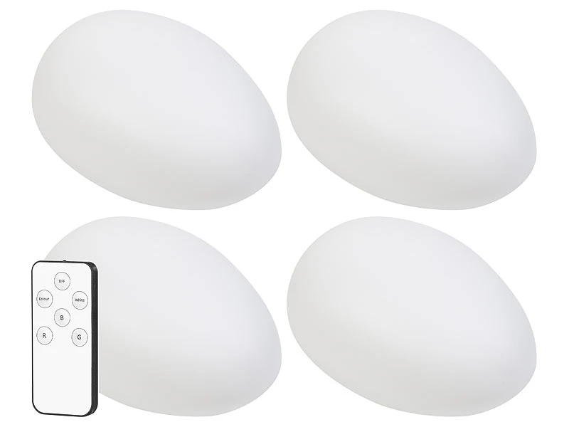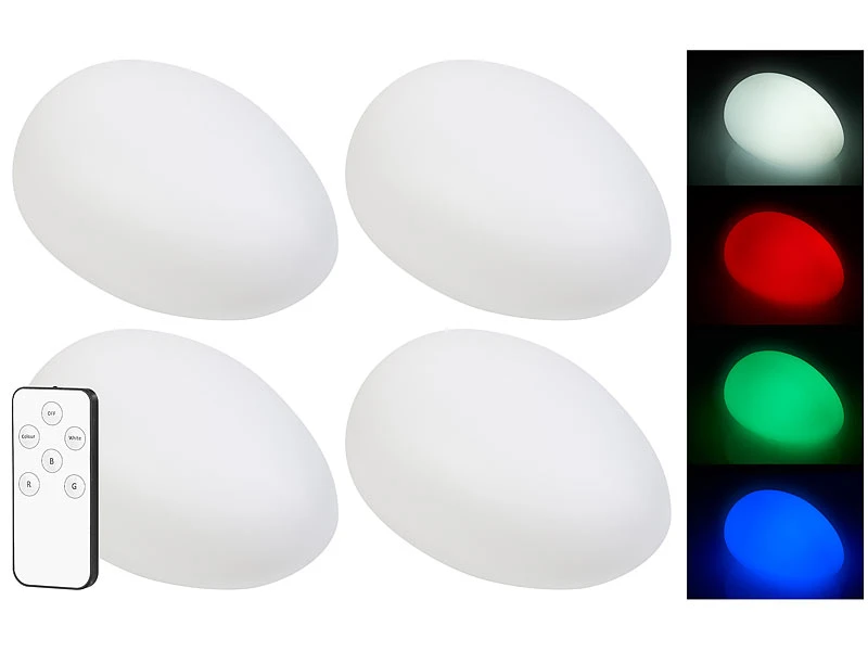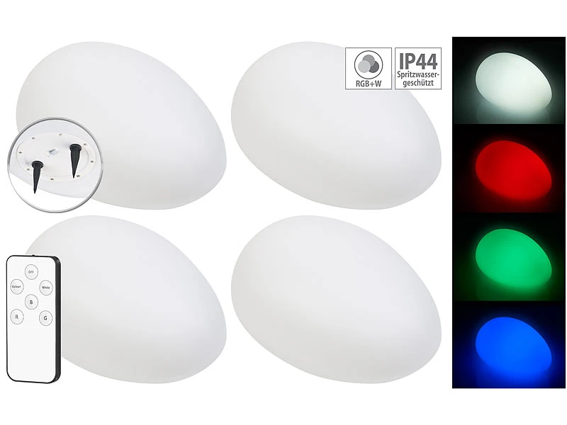 - 4 LED-Deko-Steine je inklusive Akku, Fernbedienung mit Knopfzelle, 2 Erdspießen und deutscher Anleitung