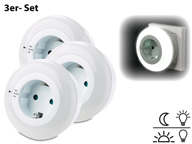 - 3er-Set Nachtlichter mit durchgeschleiften Steckdosen